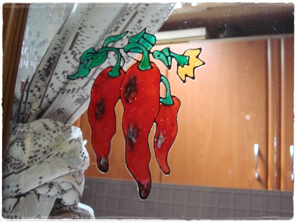 我突然間發現,娘家媽媽廚房的門上,竟然,有著數年前小舅幫媽媽畫上的辣椒圖案。
